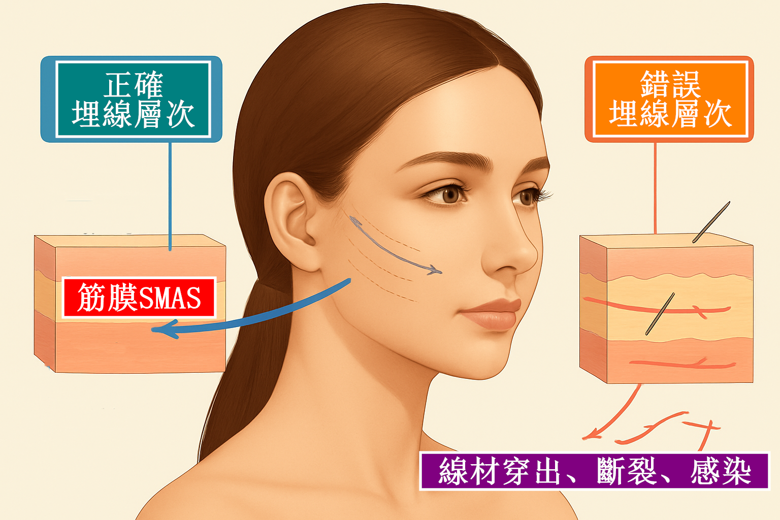 1. 埋線層次過淺: 將埋線置放在表皮層、真皮層、皮下組織層,副作用包括